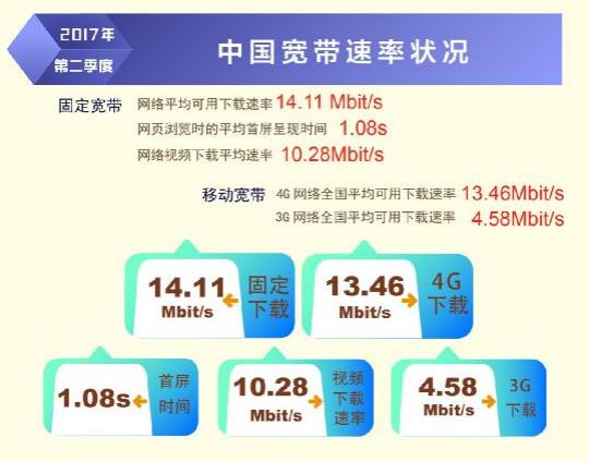 日前,寬帶發(fā)展聯(lián)盟發(fā)布了第 16 期《中國寬帶速率狀況報(bào)告》(2017 年第二季度)。報(bào)告顯示 2017 年第二季度我國固定寬帶網(wǎng)絡(luò)平均下載速率達(dá)到 14.11Mbit/s,比 2017 年第一季度提高了1.1Mbit/s,同比去年第一季度提升了 34.8%。自 2015 網(wǎng)絡(luò)“提速降費(fèi)”工作開展以來,我國固定寬帶可用下載速率連續(xù) 10 個(gè)季度持續(xù)提升,總提升幅度達(dá)到 3.3 倍。同時(shí),我國移動寬帶用戶使用 4G 網(wǎng)絡(luò)訪問互聯(lián)網(wǎng)時(shí)的平均下載速率達(dá)到 13.46Mbit/s,環(huán)比 2017 年第一季度也有 14.2%的提升。