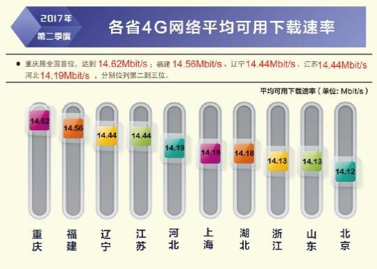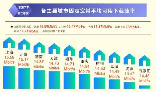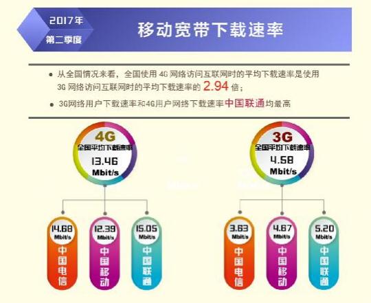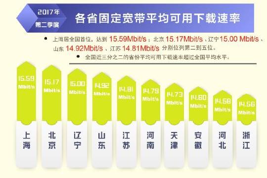 根據(jù)本次報(bào)告,除西藏自治區(qū)外,全國其他所有省級行政區(qū)域固定寬帶平均下載速率均超過 12Mbit/s,上海、北京、遼寧率先超過或達(dá)到了 15Mbit/s,位列全國前三,山東、江蘇緊隨其后。在直轄市和省會城市固定寬帶下載速率排行榜上,上海、北京、濟(jì)南、天津、福州位居前五位。從移動寬帶網(wǎng)速狀況看,重慶、福建、遼寧、江蘇、河北的 4G 網(wǎng)絡(luò)用戶下載速率排在全國省級行政區(qū)前五位;不同電信運(yùn)營企業(yè)中,中國聯(lián)通的 3G 網(wǎng)絡(luò)用戶下載速率和 4G 網(wǎng)絡(luò)用戶下載速率均最高,分別達(dá)到 5.20 Mbit/s 和 15.05 Mbit/s。